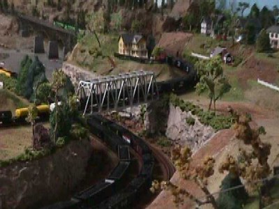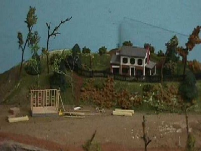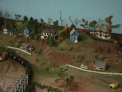 At the door is Cheyenne Hills, owned and built by Joe Morgan. This module represents Joe's first attempts at modeling a scene in N scale. He's done a good job. Notice the wedding in the back yard of the yellow house. See the house under construction? Notice the details, including the scratch-made sawhorses. The road improvement crews are working mightily while, off in the distance, three kids ride their bikes.