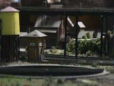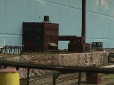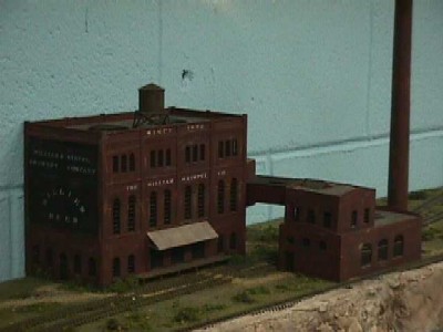 Left of One Palm Corner and along the wall is Burnside Roundhouse and Station, owned by the club in memory of Charlie Burns. These three modules, containing a round house, turntable, brewery, passenger yards, and station were purchased by Charlie Burns and donated to the club prior to his death on January 20, 1997. Notice the interior detail in the smaller, roof-less roundhouse building. The club is planning to re-motor the turntable and renovate and refurbish this module complex. The William Kimpel Brewery may have to be moved as part of this renovation.