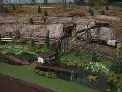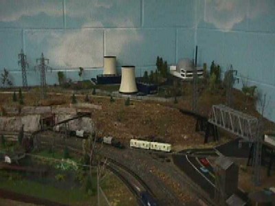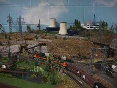 Looking over Poverty Gulch, in the far back corner is Nuclear Edge, owned and built by Joe Morgan. Here you find a modern nuclear power plant with two cooling towers, each having its own cooling pond. Look at the detailed vegetation in the ponds. Much of this mini-scene is scratch-built. Notice the reactor in the far corner and the substation made with resistors. The transmission towers that flow onto the module on the right are modified HO scale models.