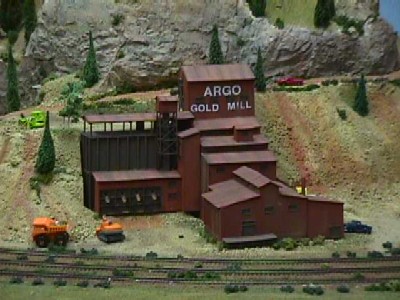 Just to the left of Cheyenne Hills is the Argo Mine, owned and built by Don Seidel with scenery construction help by Jerry Huber. This module features a large gold mining operation based upon the real thing which is still standing in Idaho Springs, Colorado. The mine building is a modified kit. Notice the blending of colors in the mine tailings and the exquisite rock work, just like the real thing.